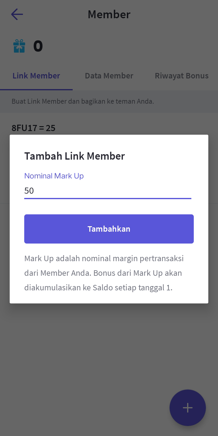 Cara mendaftarkan downline, selain menggunakan format daftarkan downline yang dikirim melalui SMS, WhatsApp, Telegram, dan juga sistem Autoreg, Anda juga bisa mendaftarkan downline melalui link referral yang diarahkan langsung ke aplikasi android. Link referral bisa didapatkan di aplikasi android akun anda. Klik “Member” di sisi kanan atas, di bawah hasil Bonus. Lalu, klik “Link Member” untuk mendapatkan link referral. Setelah masuk di halaman “Link Member“, klik tanda “Tambah ( + )” di pojok kanan bawah. Kemudian isi “Nominal Mark Up“ sesuai dengan keinginan Anda, misalkan 50, lalu klik “Tambahkan“.